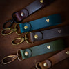 Schlüsselanhänger aus Naturleder, geprägt mit einem Herzsymbol in Goldfolie. Erhältlich in fünf Farben: Schwarz, Dunkelbraun, Grün, Mittelbraun und Weinrot.